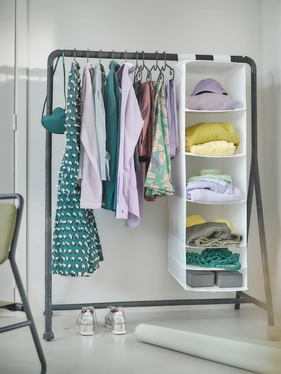 A black wardrobe rail on castors is the ideal storage solution for a fashionista who wants to make clothes and accessories a feature of the space. It’s sturdy, stylish and easy to move around. Check your outfit from top to toe with a full-length mirror that will make your room lighter and brighter.