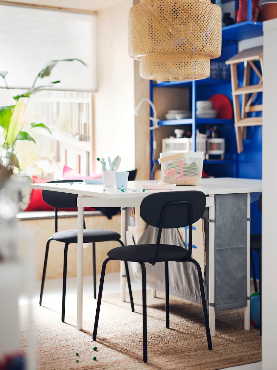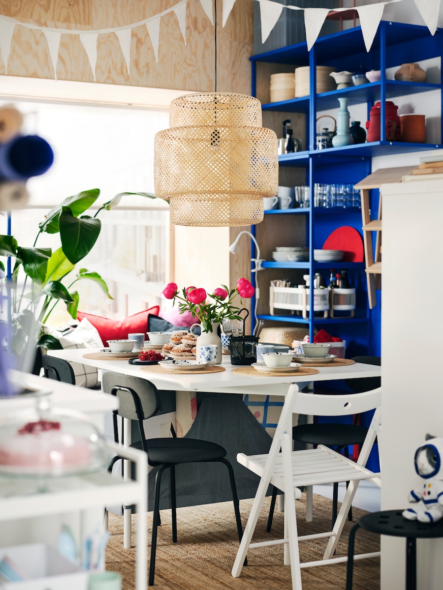 Get inspired with this tiny dining room’s joyful Scandi style and smart storage solutions. The white base combined with primary colours makes the space appear larger, giving it a playful and light feel. A flexible, space-saving dining table and thoughtful placement of furniture make everyday life flow in this small (and happy) space.