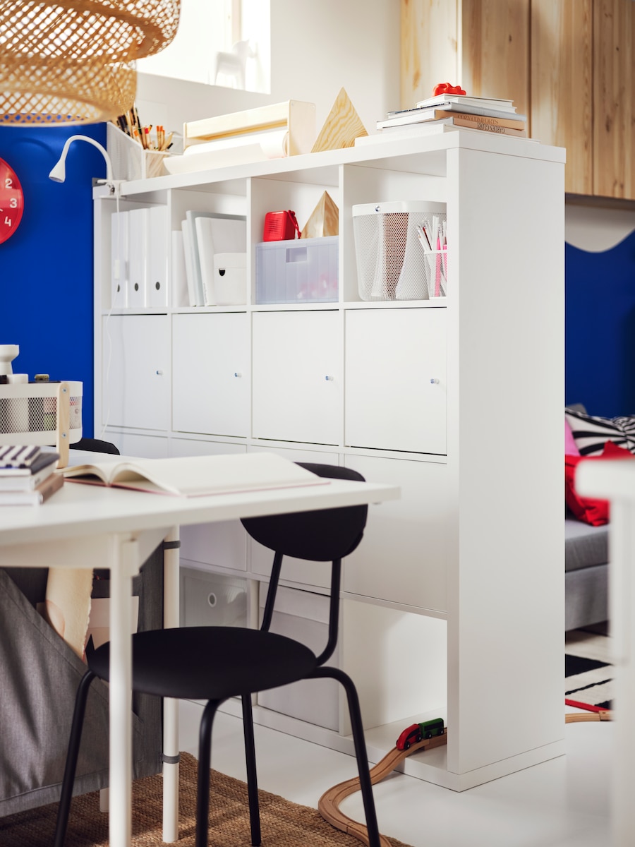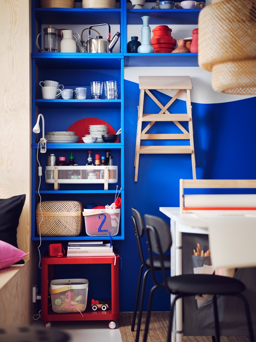 This shelving unit is used as a room divider while providing storage that is accessible from both sides. The punchy blue storage combination is a strong statement piece, but also very practical for storing tableware. Pro tip: group tableware in neat formations for an uncluttered look.
