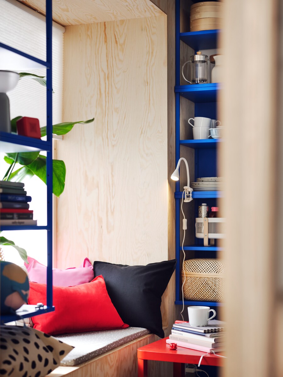 We optimised this window ledge by creating a cosy nook for relaxing on your own, or as extra seating when needed. Bold, patterned textiles combined with solid coloured ones create a vibrant yet balanced look.