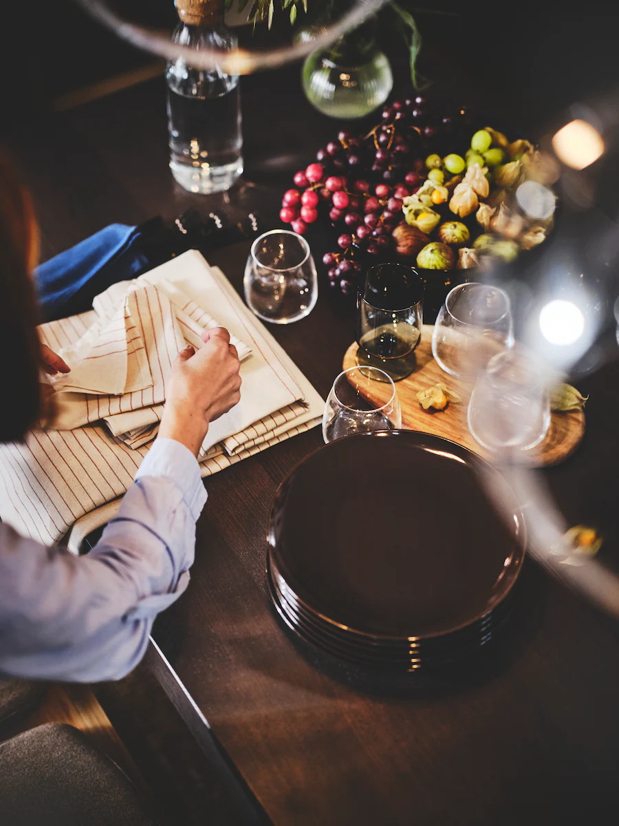 Using candlelight will cast a warm glow over the table while also acting as a decorative centrepiece. When hosting a celebratory dinner or an adult dinner party, the glass candle holders and vase with striped effect reflects light around the room and provides a relaxing and cosy atmosphere.