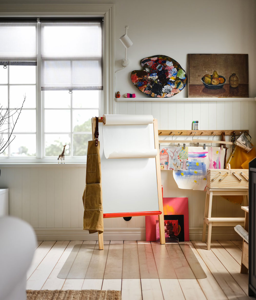 Helping little ones to find and look after their own things from an early age was one of Mia’s goals with this home. She made sure to include storage that the children could easily access themselves, like boxes and hooks at a low height. “I also created designated activity zones, like an art corner and planting table, where everything the children need is all in one place.”