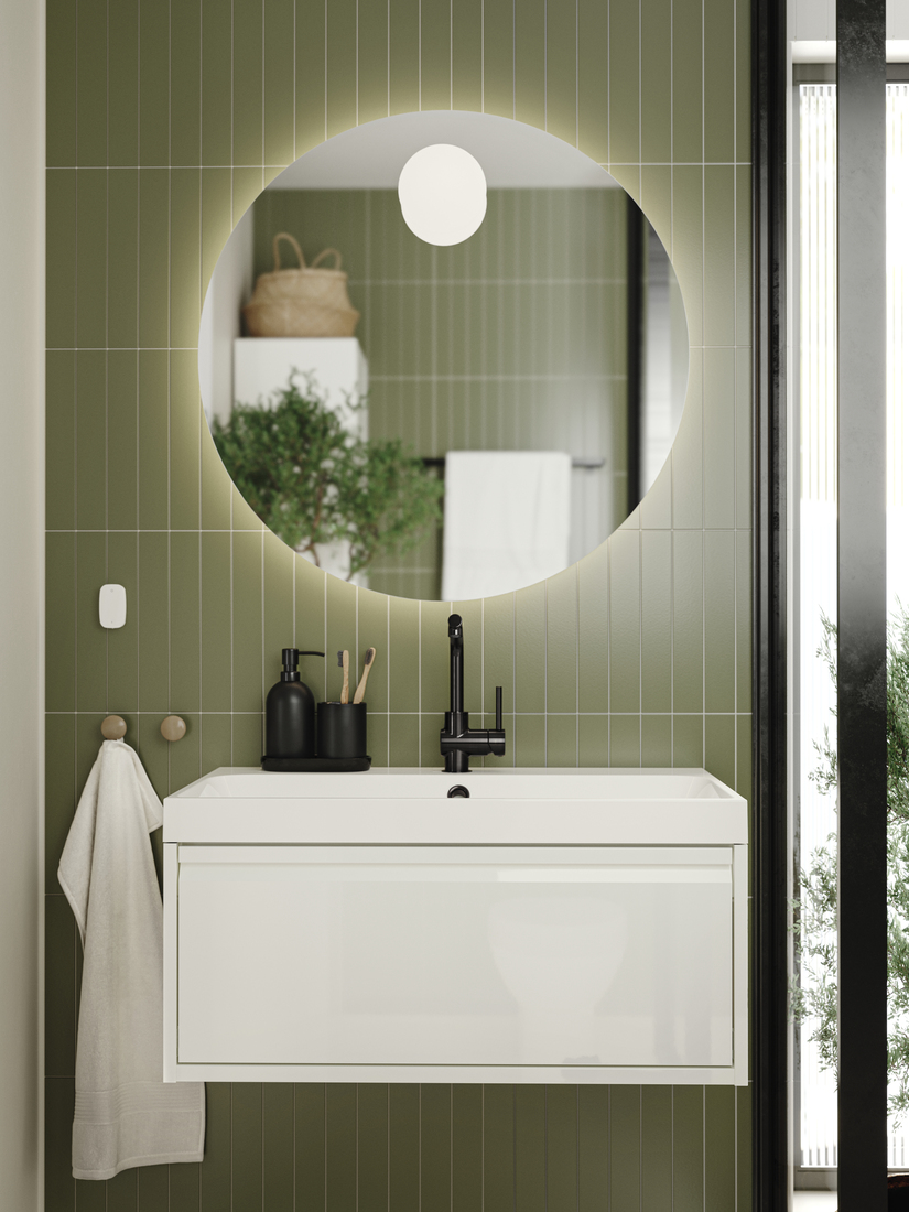 Good functional light around the bathroom mirror is important as this is where most of the action is. A mirror with built-in lighting can be a smart choice for a compact solution that spreads the light evenly, not just up close but across larger areas of the bathroom.