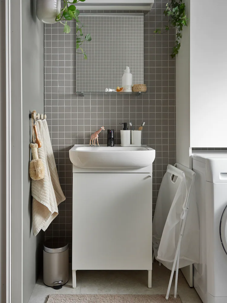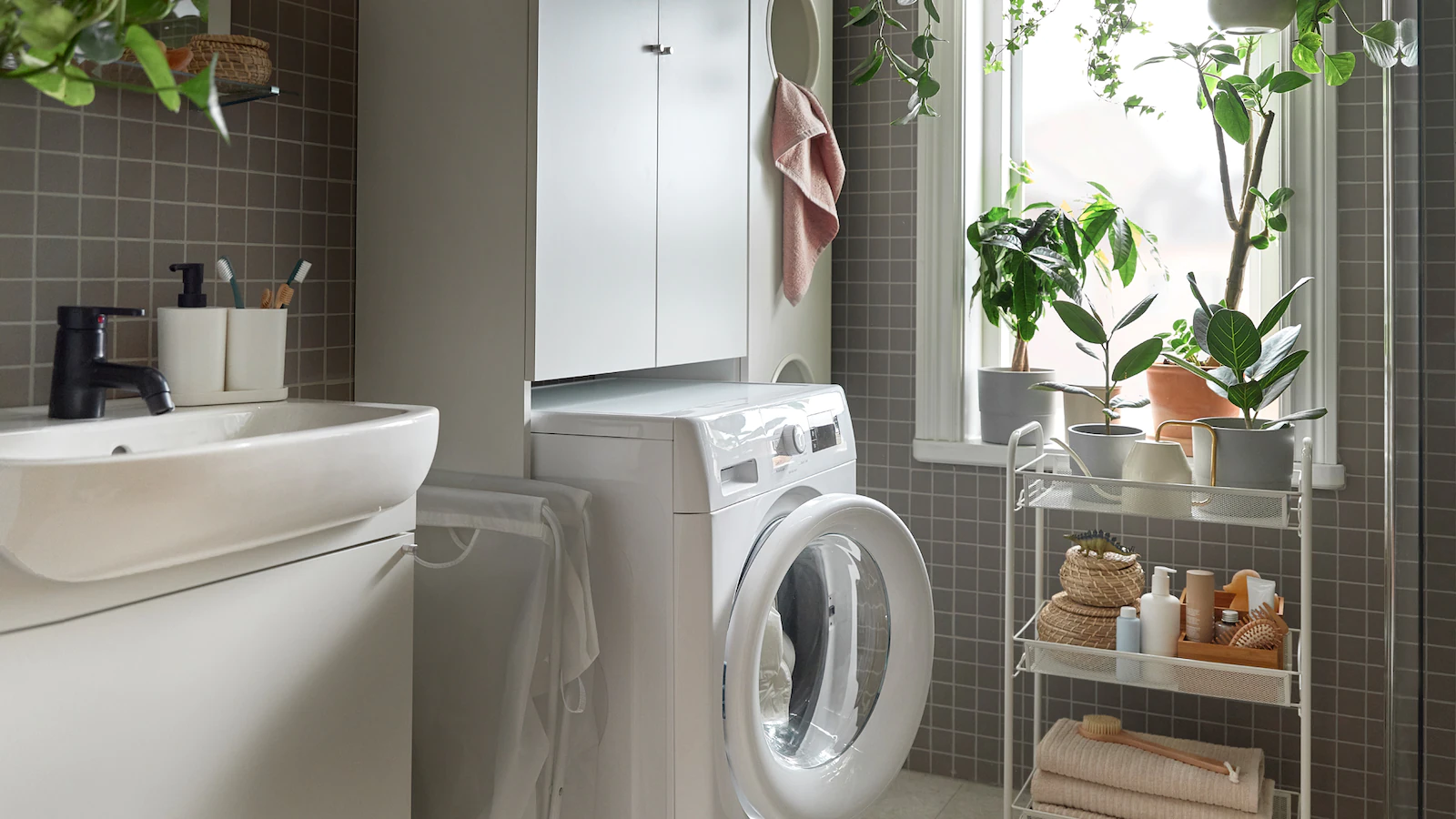 This white washbasin combines with the mirror and the quiet colour of the wall tiles to create a calming atmosphere. And the black, water-saving faucet adds the final touch of visual balance to this relaxing yet functional area. All your family bathroom essentials, with laundry utility close at hand.