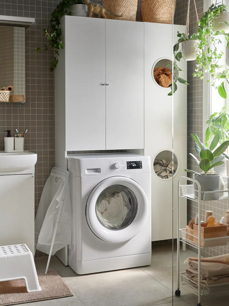 This compact yet airy bathroom-laundry solution stows the washing machine neatly, offering storage for the whole family with space to sort laundry and place to store it, along with all the usual bathroom necessities. Compact utility and coordinated style, inside and out, for a total bathroom in a small space.