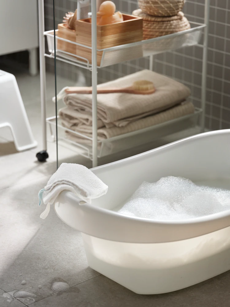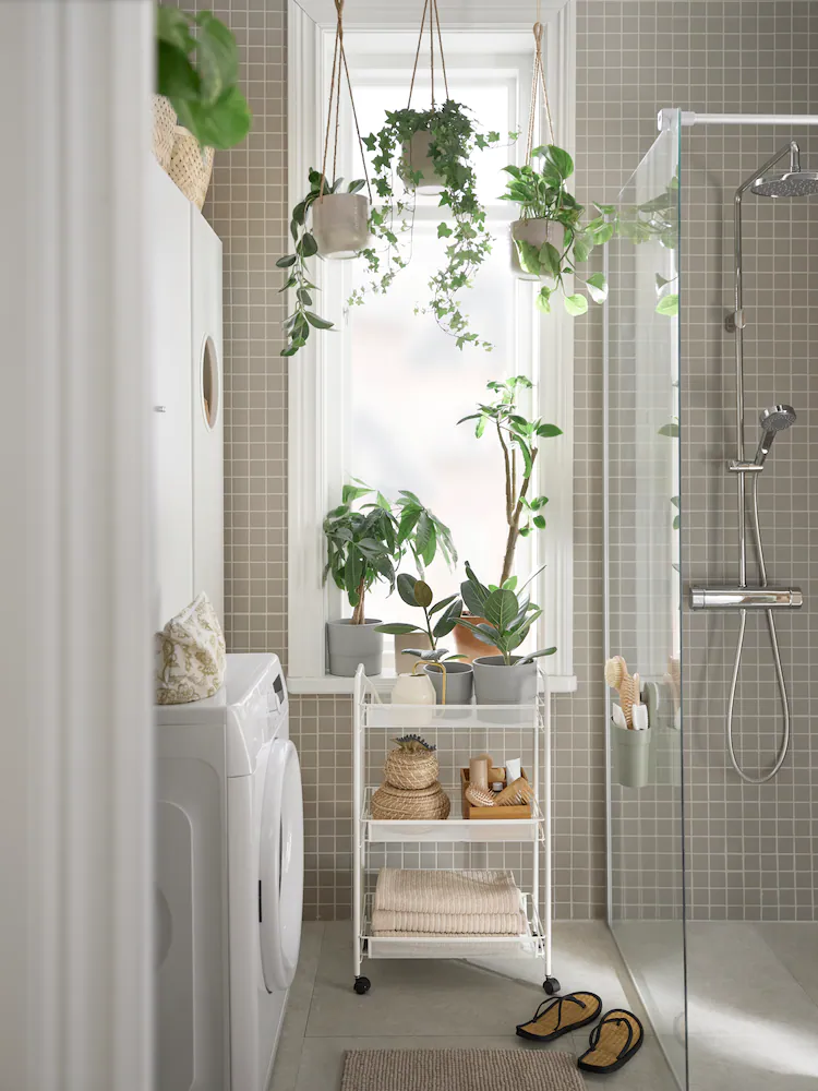 A flexible bathroom for everyone, shared space with multiple uses for multiple people. We mixed refreshing greenery for atmosphere along with trolleys for mobile utility and storage. Feeling with function. Room for the kids too, in this relaxing space with a place for everything. Out with chaos, in with calm.