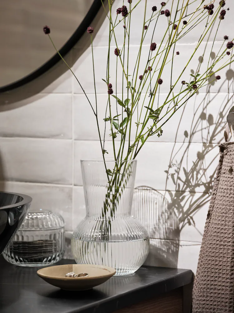 This modern bathroom has a clean and sharp look with that touch of elegance. Browns, grey and black help create calmness to frame your personality. A place with room for essentials on the surface next to the washbasin, or you can choose decorative greenery in a chic glass vase. Make elegance yours.