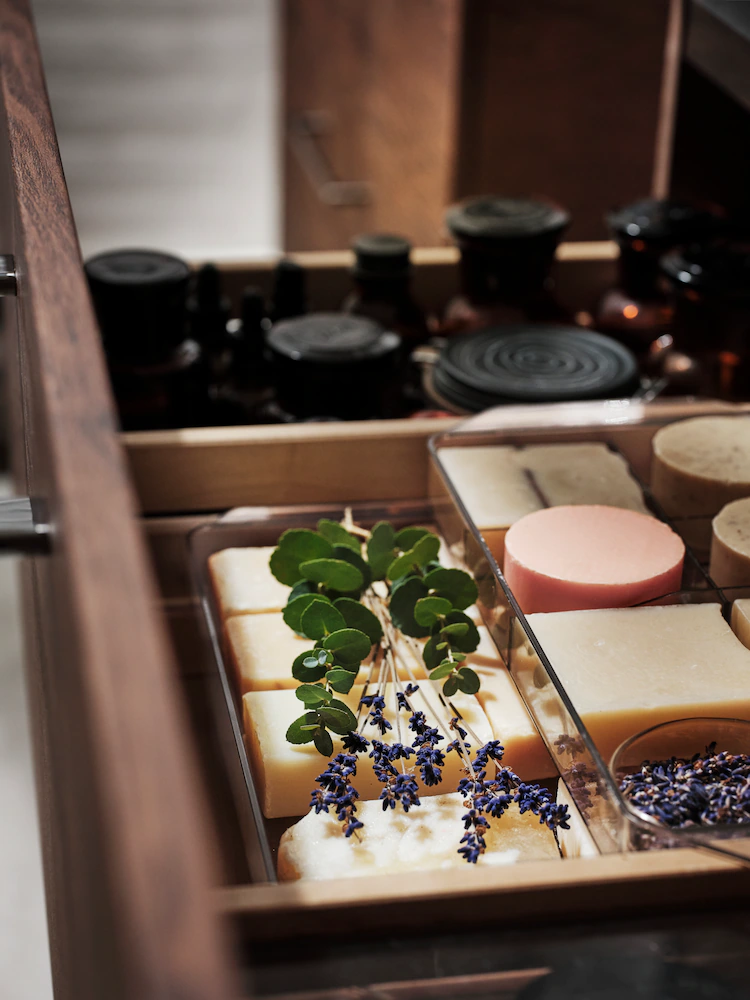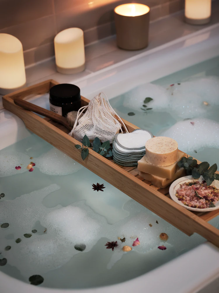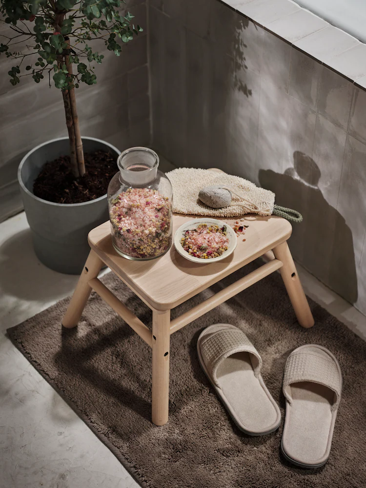 These scented candles add sensual light and fragrance, the perfect surround for your self-care, bathing routine. A handy and stylish bath rack for your soaps and cotton pads. And a stool beside the tub gives easy access to even more bathroom luxury. Complete and convenient self-indulgence.