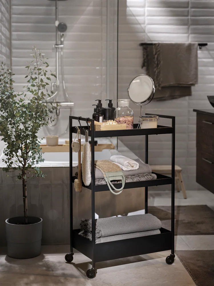 Space-saving storage mobility makes more of your bathroom. This trolley makes a mobile home for your bathroom necessities. It frees up floor space when you want to get dry, then you have your towels, exfoliation products, soaps, skin creams and scrubbing brushes nearby. Stylish storage on wheels.