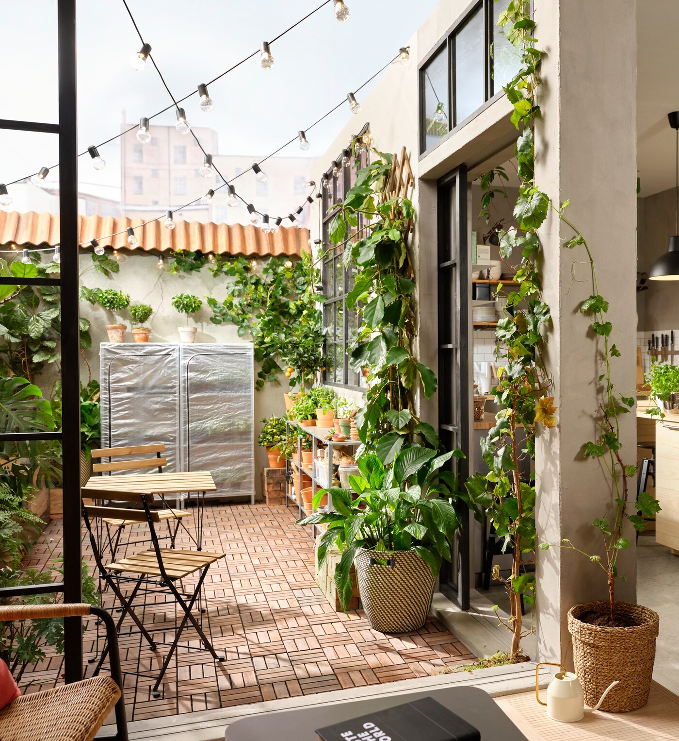 If you’re lucky enough to have a big balcony, terrace or garden, you can create a botanical haven with a combination of big and small plants. Place them high and low, planted in the ground or pots (or both), and always in corners. The less you can see of the walls, the better. Laying out a floor and adding cosy lighting creates the feeling of a room – a magical place to enjoy the sun, the rain, mornings, evenings or just a simple cup of tea.