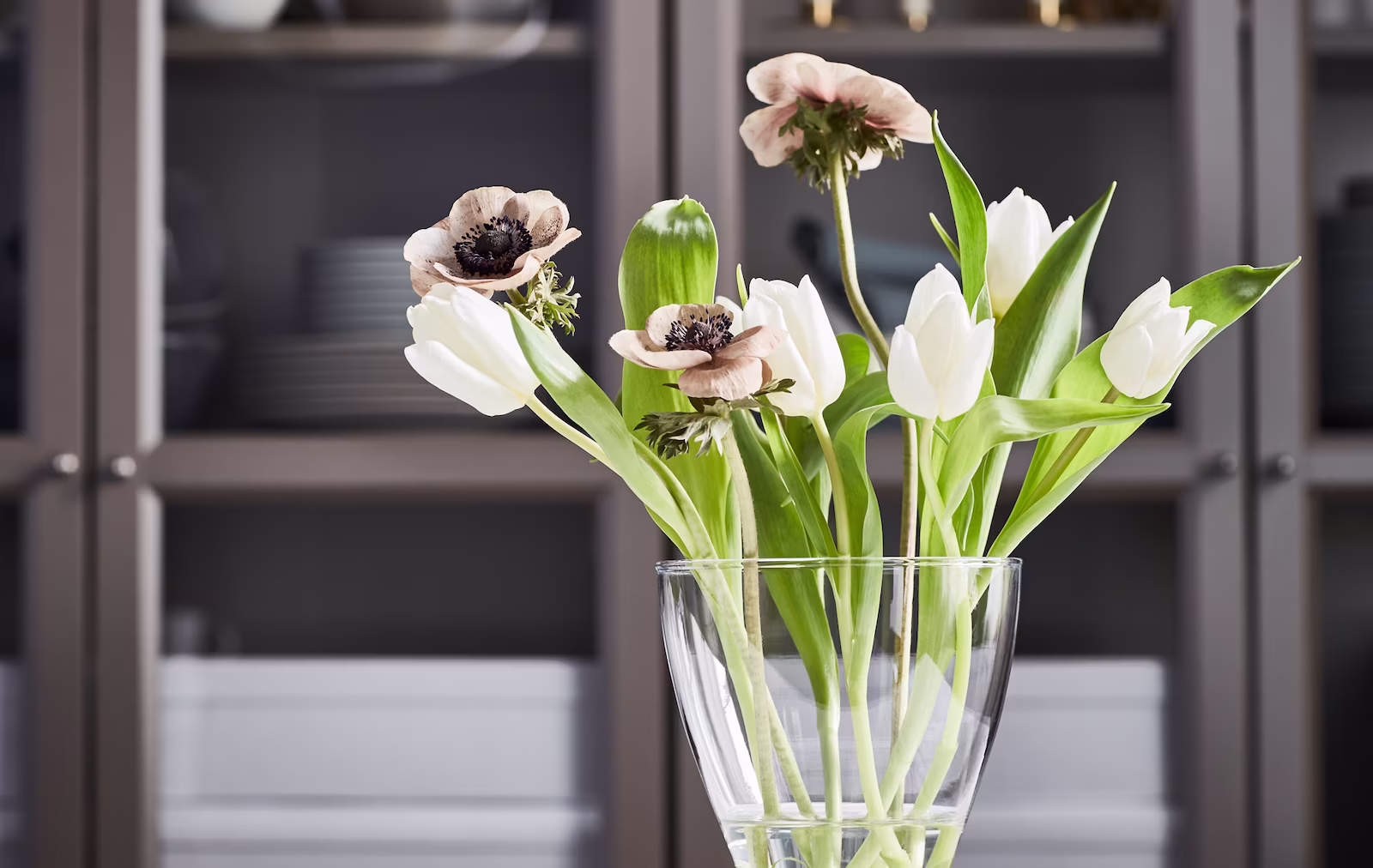 If you’re longing for more plants but space is tight, you can put up shelves for smaller pots and vases on different heights. A hanging arrangement holds plenty of plants and works perfectly in kitchens and bathrooms as well.