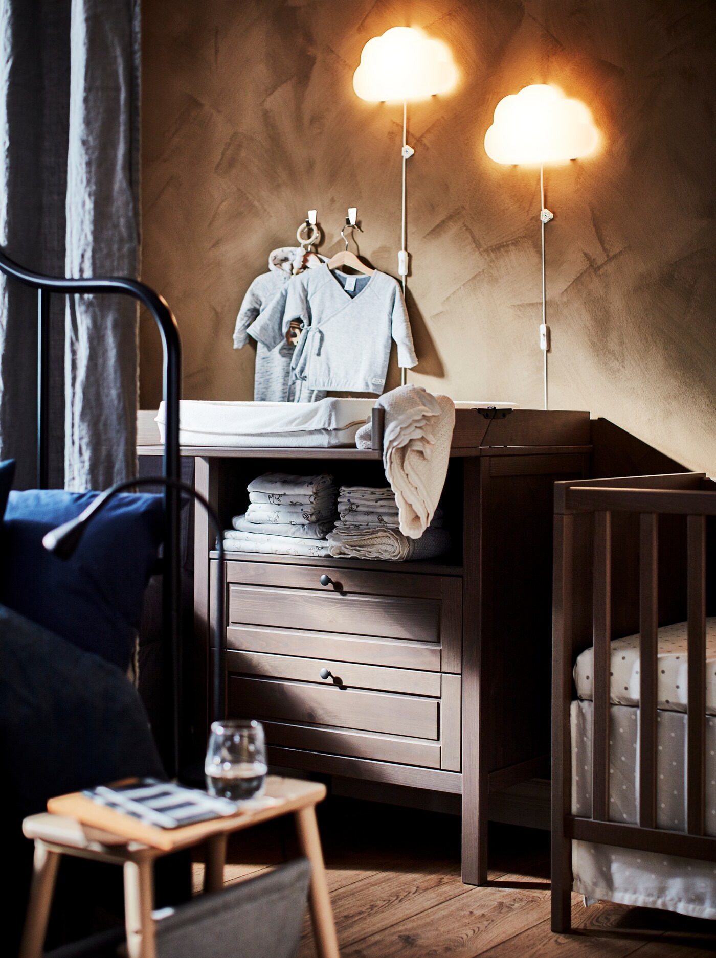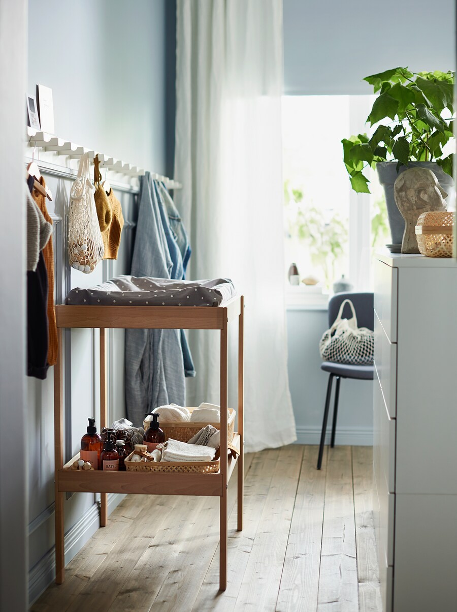 Babies need plenty of love and attention, but not a lot of storage space. For now, a changing table with a shelf below (and a few spots on the hook rail) will do the trick.