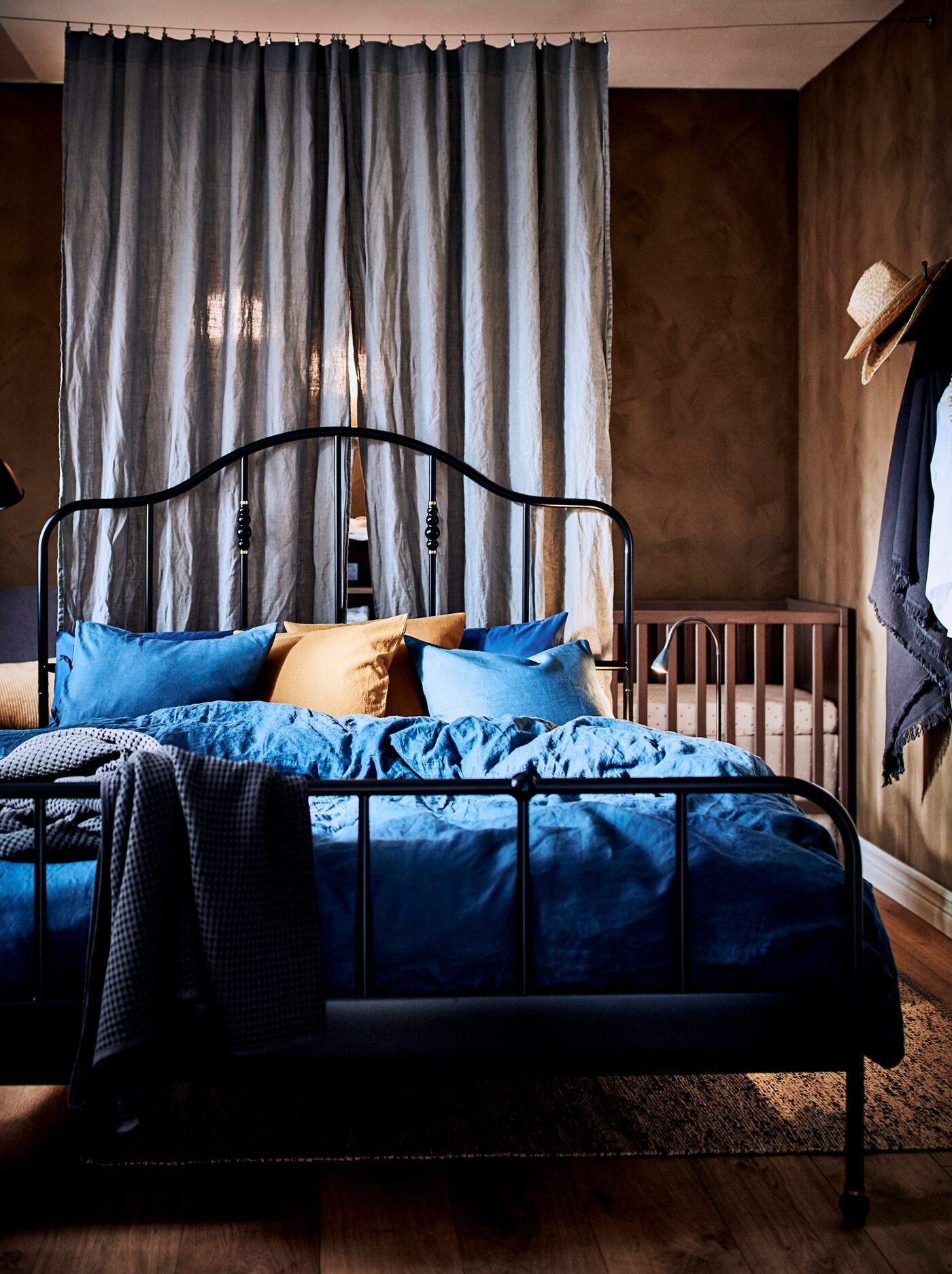 Dividing the room with a curtain gives these parents a feeling of personal space, while keeping baby close by.