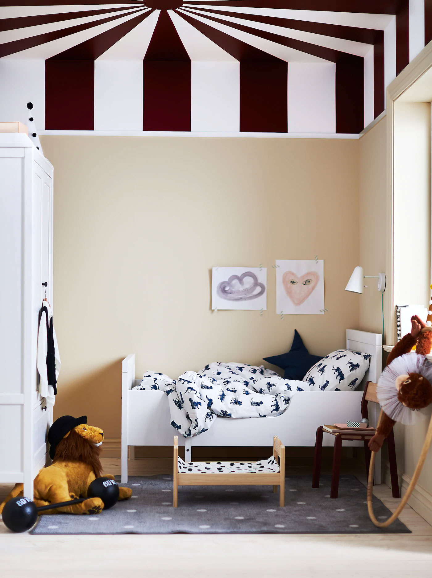 Even if the circus tent ceiling doesn’t stay in town forever, white or pine furniture (including an extendable bed) will always look great, no matter what colour ends up on the walls next.