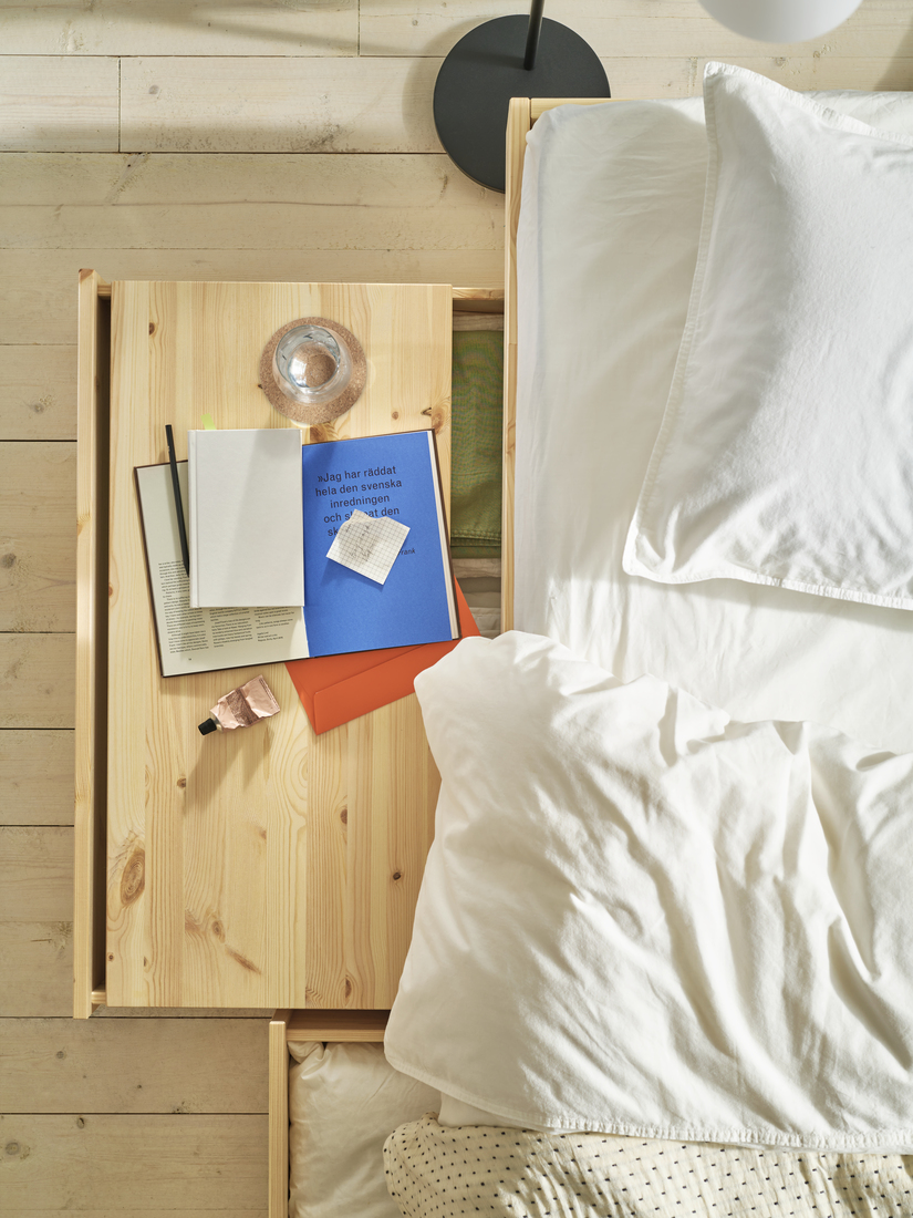 Multifunction! It’s hiding both under and within GLAMBERGET extendable bed with storage. The bed frame works with mattresses of different widths, so when you need a bigger bed you can keep the frame and just update the mattress. The included trays also fit the two drawers under the bed, to double as bedside tables.
