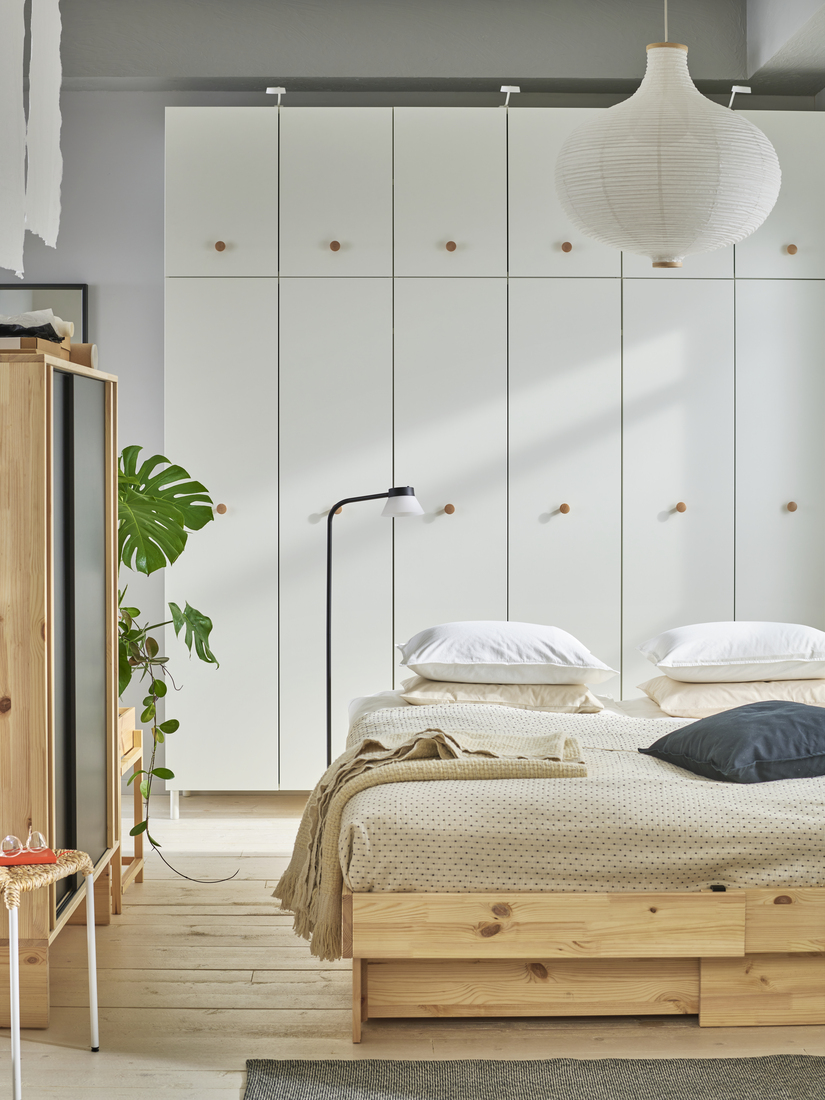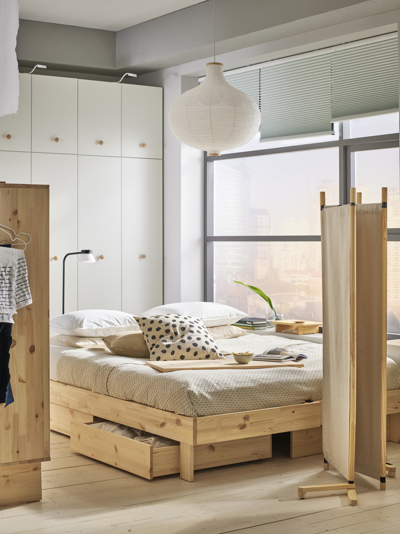 The trick to create and maintain a harmonious look in a multifunction room, is to make really conscious choices of what goes into the room. With GLAMBERGET wardrobe, room divider and extendable bed, that choice is conscious in more than one way: Untreated wood and functions that grow to fit your needs, make the furniture last longer than most.