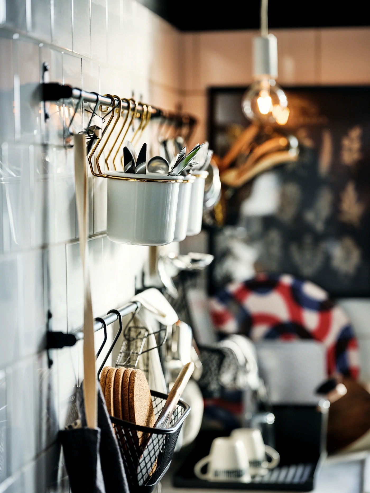 The addition of wall organisers and trolleys gives this smaller kitchen a storage boost.