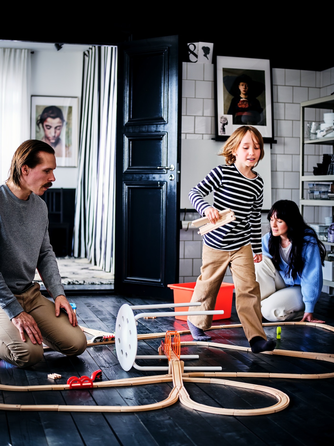Tonight’s dinner may be yet to materialise, but that doesn’t matter. As always, the dining area is a flurry of activity. The two tables pushed together can also be pulled apart when needed, creating more flexibility for everything from homework to railway construction!