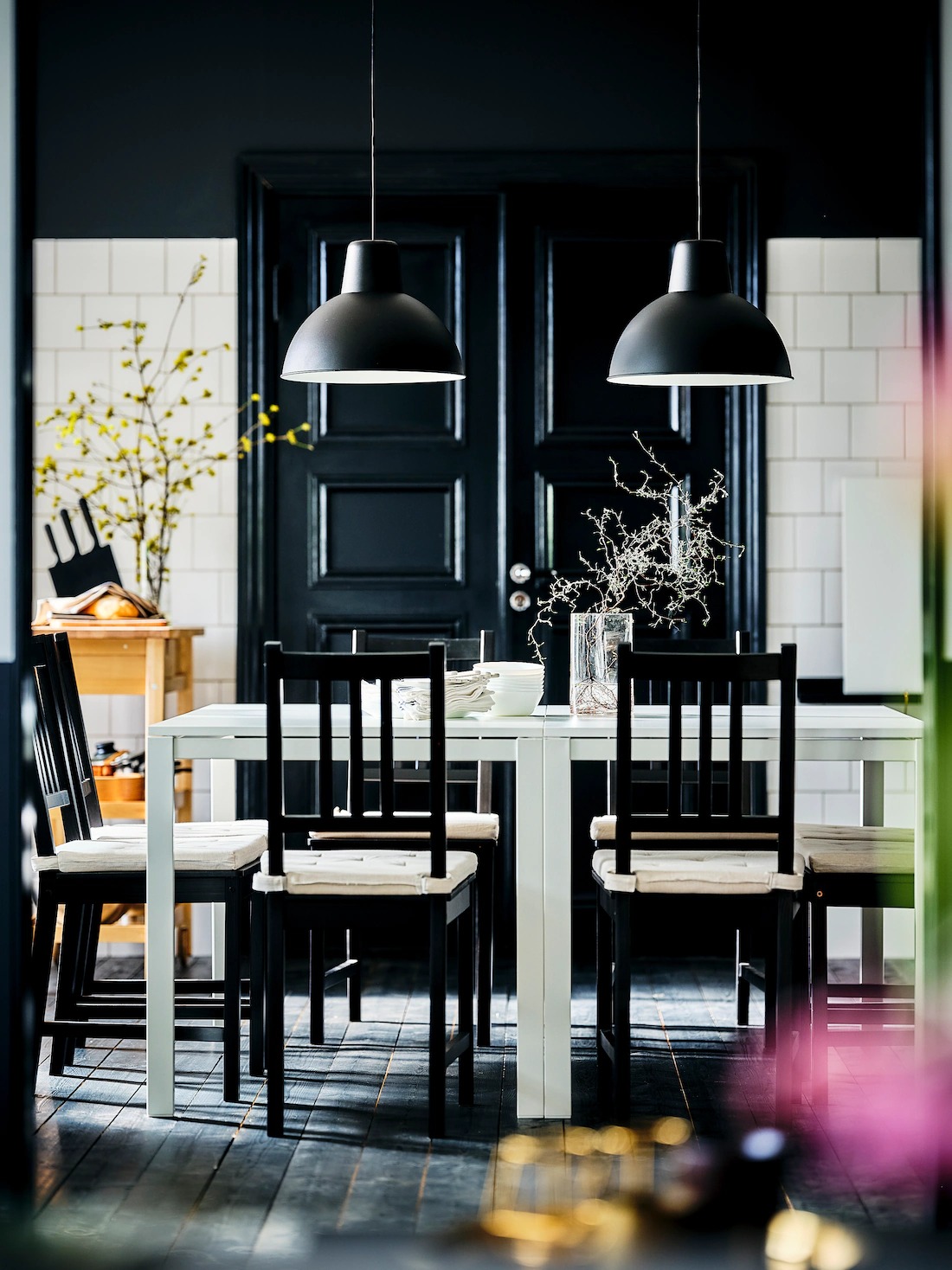 This great-value dining space can fit the whole family: push together two tables, add in seven chairs, one stool, and finish off with two pendant lamps, all for under xxx€. |