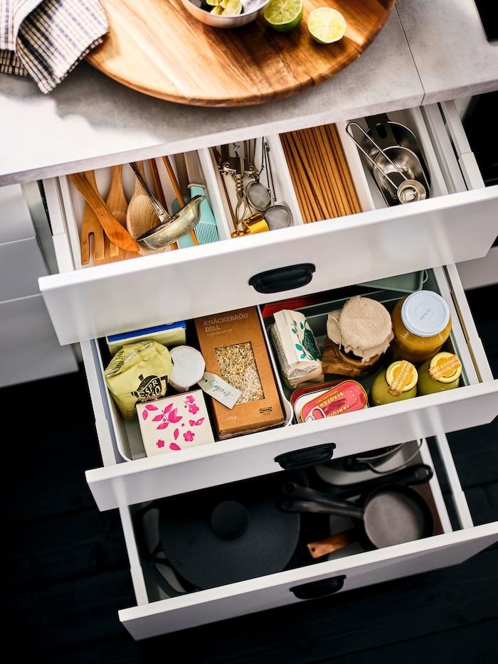 Pots, blenders, bakeware and other utensils are packed away in the kitchen drawers, leaving the walls and worktops free for this kitchen’s regular go-tos.