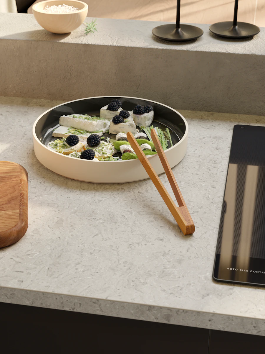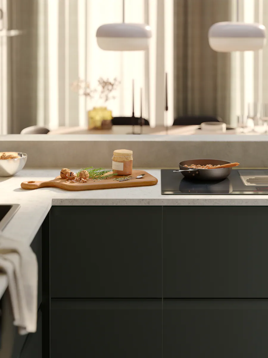 This is a kitchen with the perfect balance of feel and function for living. The rich anthracite tone of the kitchen fronts contrasts with lighter worktops. Preparing food, then enjoying it. Dark and light, cooking and eating, you and your guests, it’s all about getting the complete experience in one place.