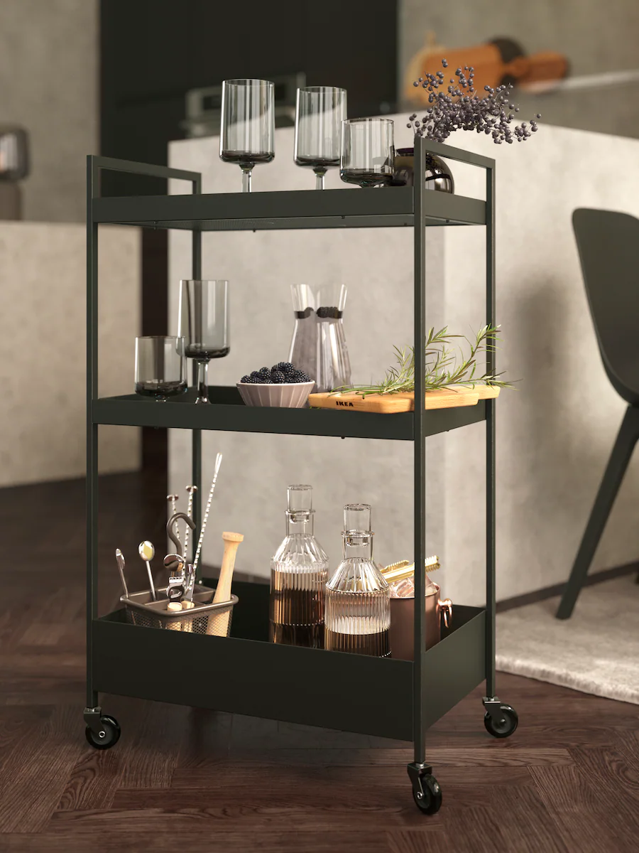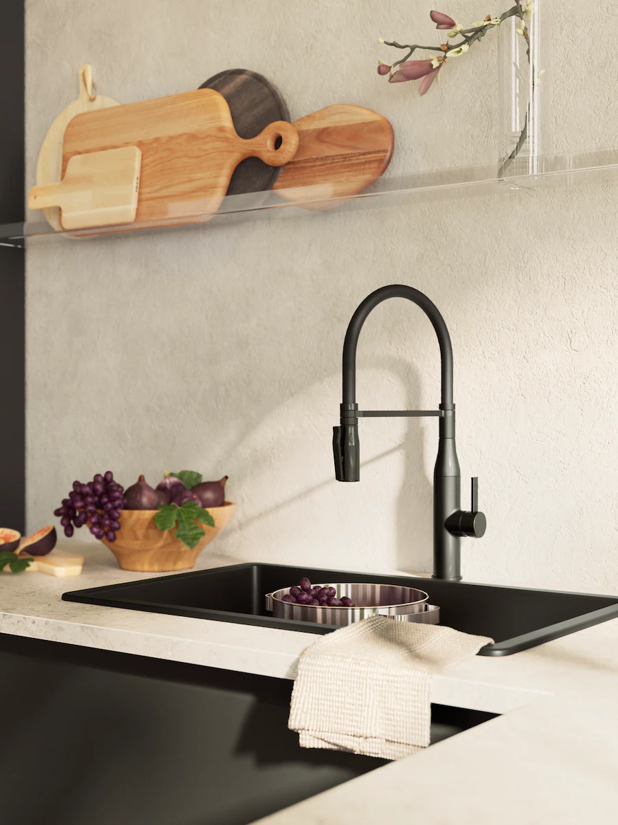 Get a little closer, and we see the beauty and utility of this complete kitchen solution. Wall shelves that hold everything from chopping boards to decorative greenery. The water-saving faucet and sink in black, together with beautiful anthracite kitchen fronts for an integrated and sophisticated look.