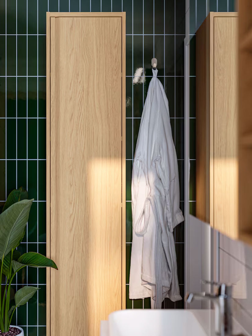 This small but personal bathroom, illuminated by great lighting, feels like a treat to your body and soul when you’re getting ready for your day or winding down when work is done. There’s room for all your things in cabinets, drawers and on open shelves, and the smooth and sleek fronts with oak effect and integrated handles create a modern and elegant bathroom that feels truly welcoming.