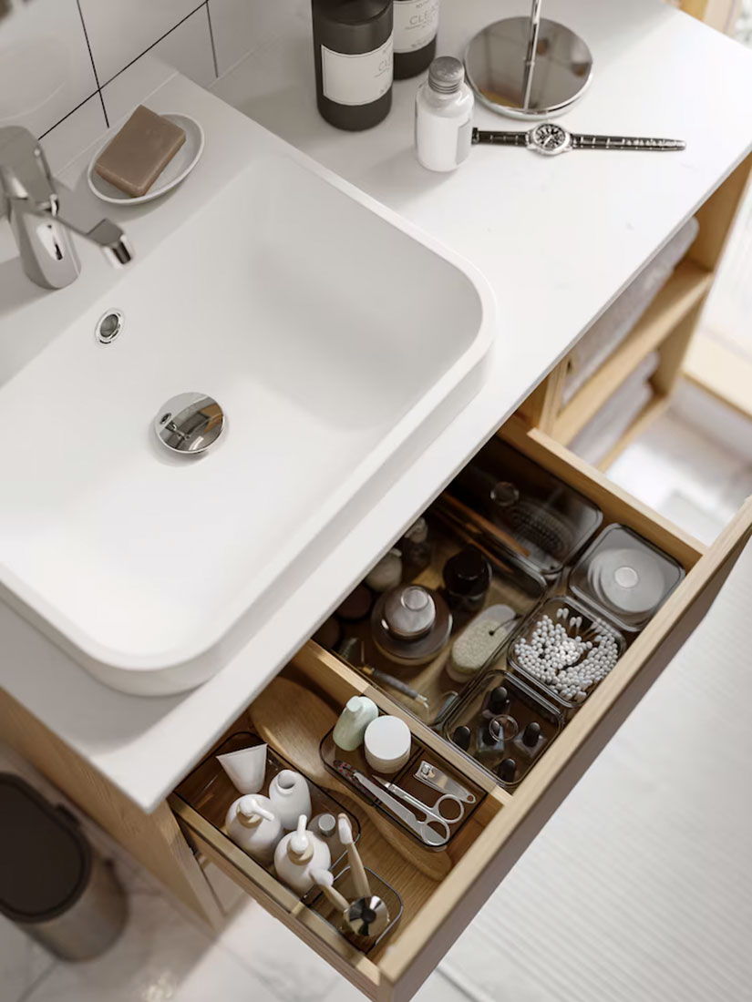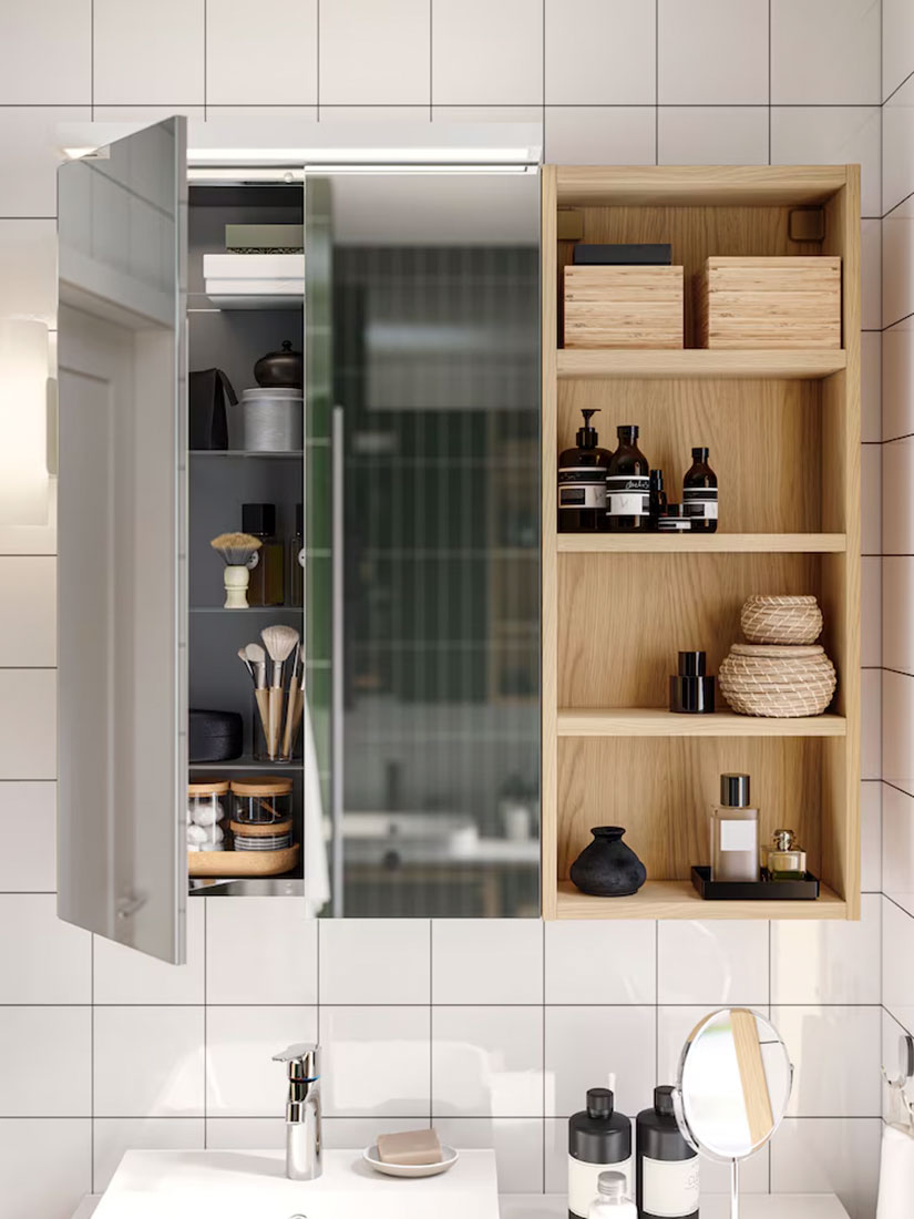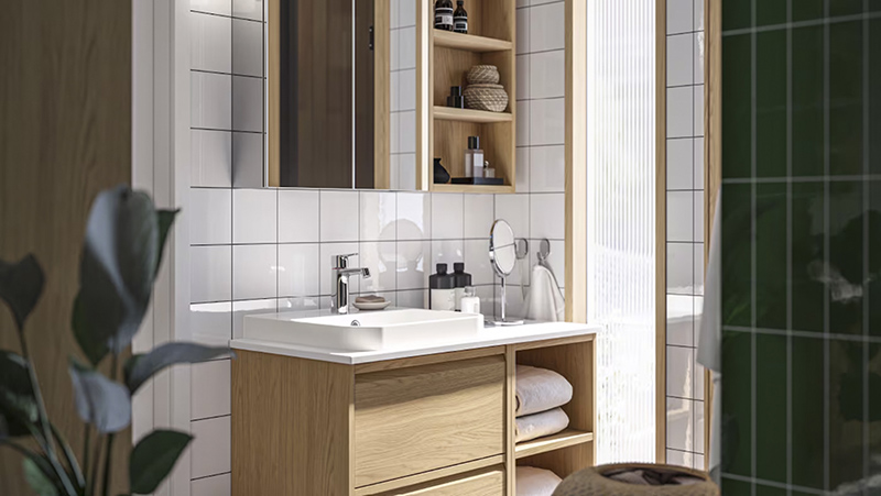 Add a personal touch to a minimalist expression – display your favourite decorative things on open shelves. Arrange other items that you want close at hand but out of sight in a mirror cabinet or in transparent boxes in a drawer. When your everyday routines are done, you simply close them for a calm look.