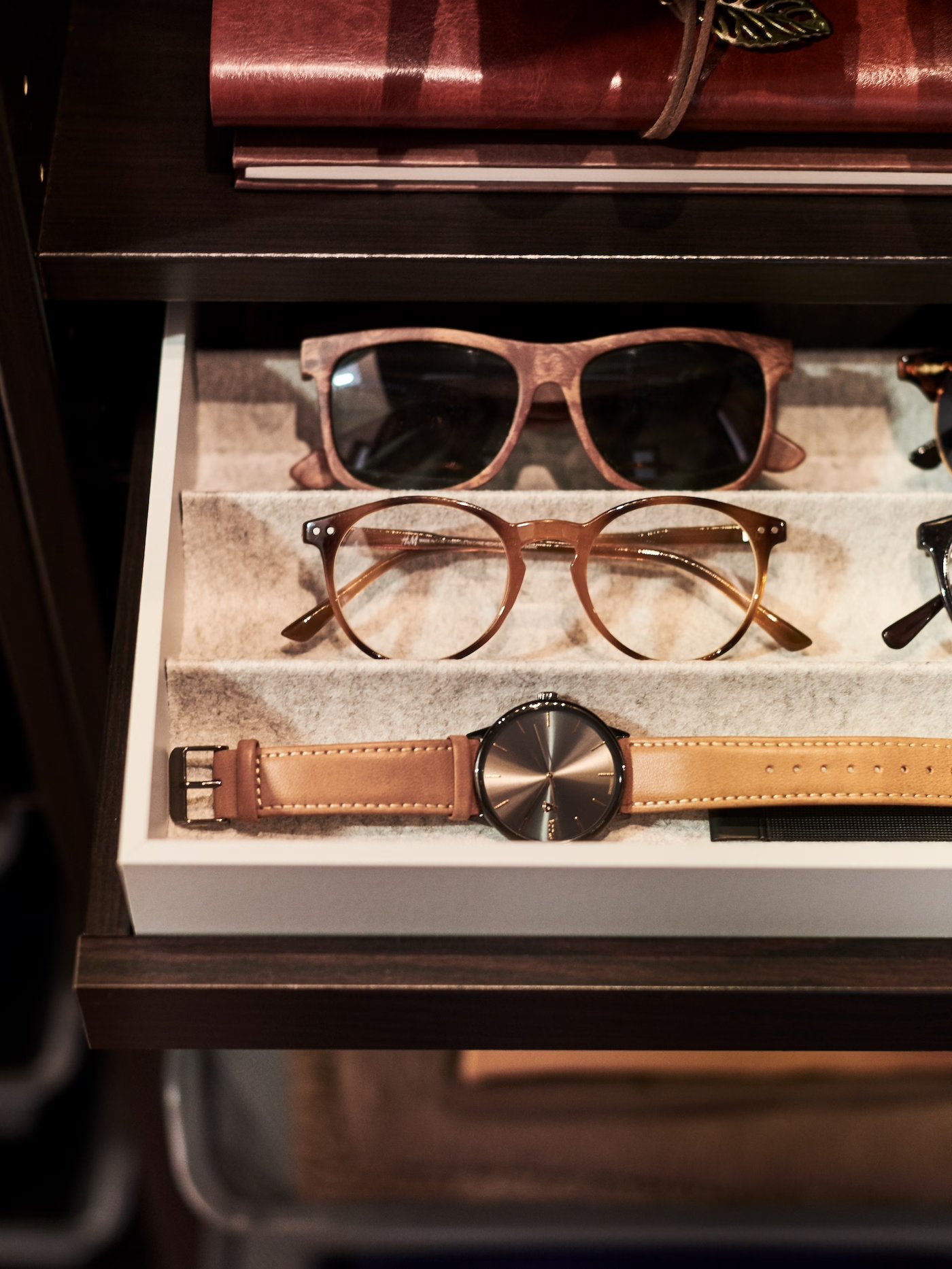 It’s taken years to build up this collection of crisp cotton shirts, cufflinks and sunglasses – and here is where they are all housed and admired. Inside organisers keep it all neat and accessible, so that every garment gets its own share of the spotlight.