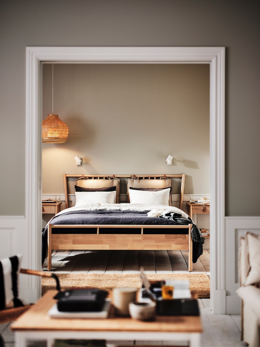 The main bedroom sticks to basics, favouring pieces made from natural materials to foster a sense of calm. A bamboo pendant lamp, wooden bedframe, seagrass rug and cotton bedding all come together to create a simple and relaxing space, with closed wardrobes keeping possessions hidden yet organised.