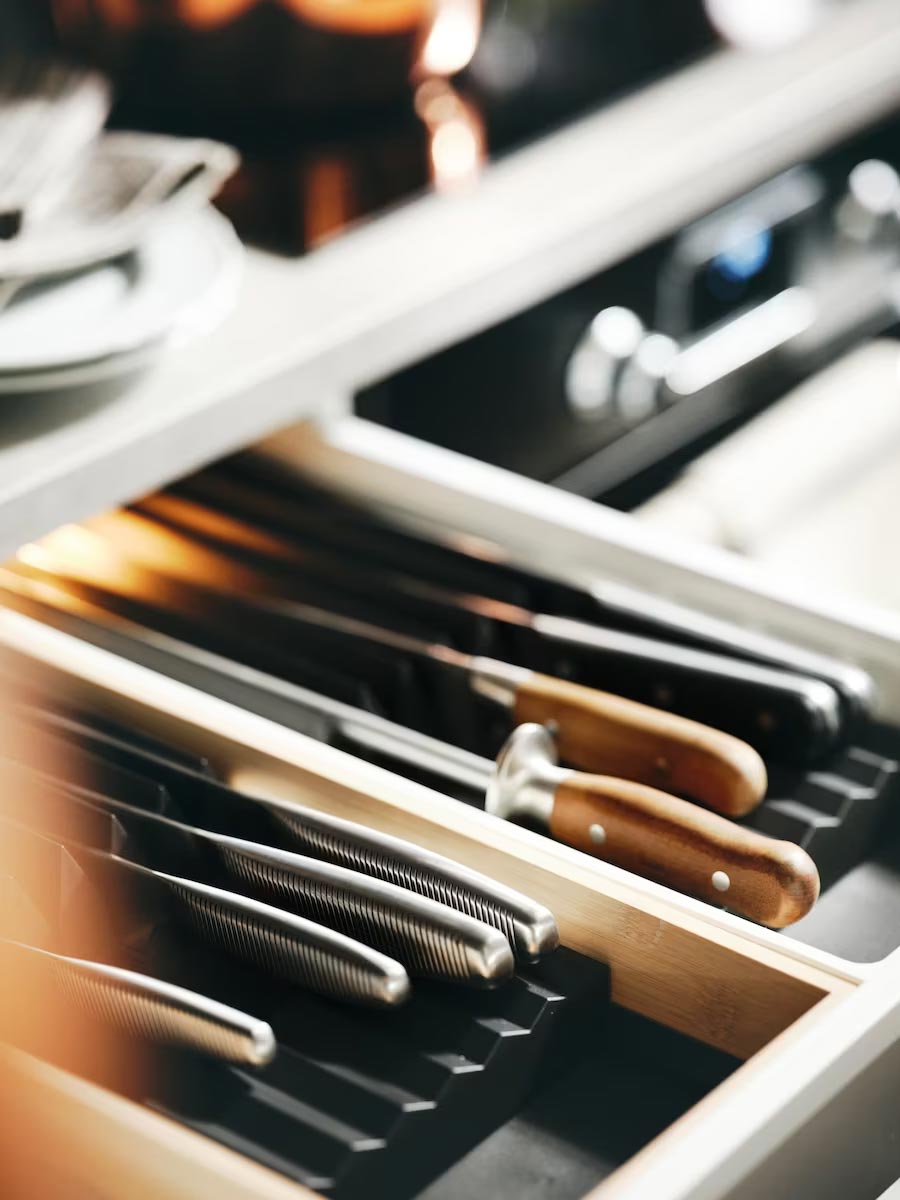 Tidy and ordered from withinWhile they occasionally share a meal, that’s where their culinary overlap begins and ends. Two keen cooks with personal preparation and serving pieces, they decided to divide the space rather than share their knives. In cupboards and drawers, interior organisers keep their pieces separated and easy to find. |