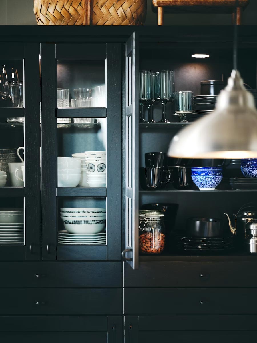 An organised collectionWhile they don’t share their crockery, they do share a love of displaying their beautiful things. Glass-fronted cabinets were the answer: keeping their two collections separate but attractively on show. |