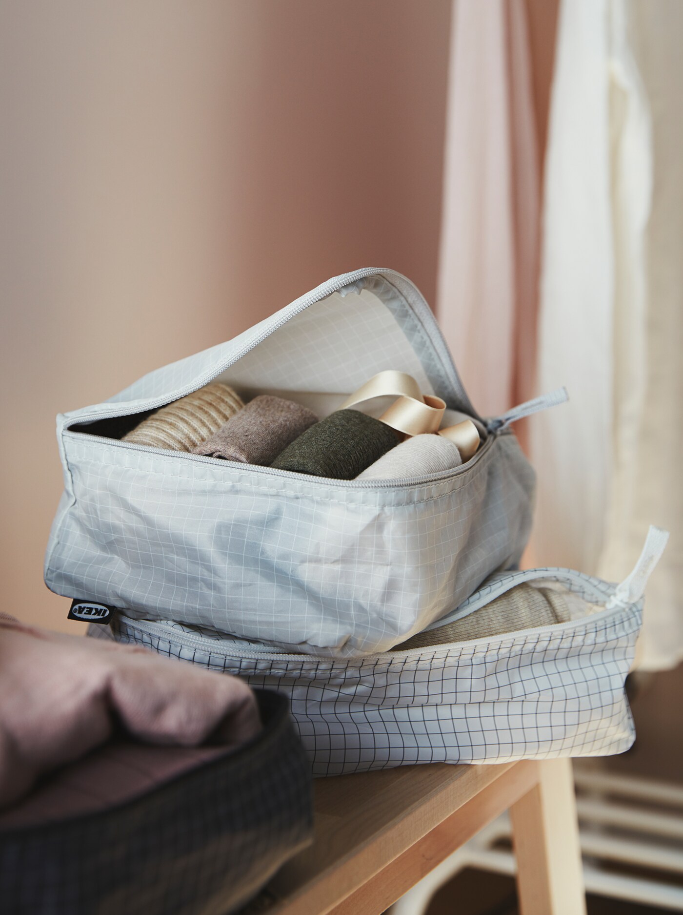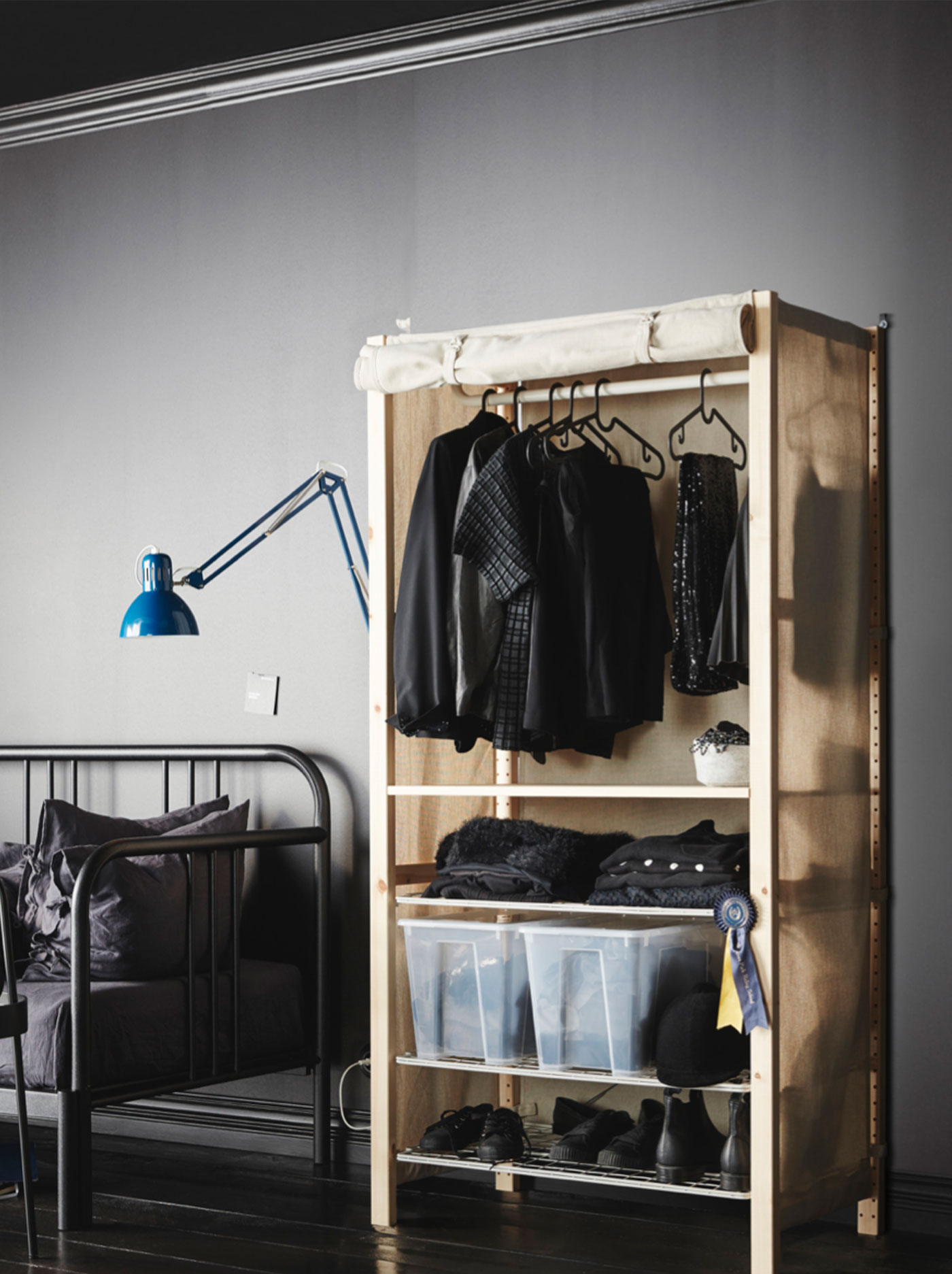 Need a wardrobe but want to avoid the bulk and sharp lines? Go with a soft lining instead. Open and accessible, or simply unroll the cloth cover for an organised, even calmer look.