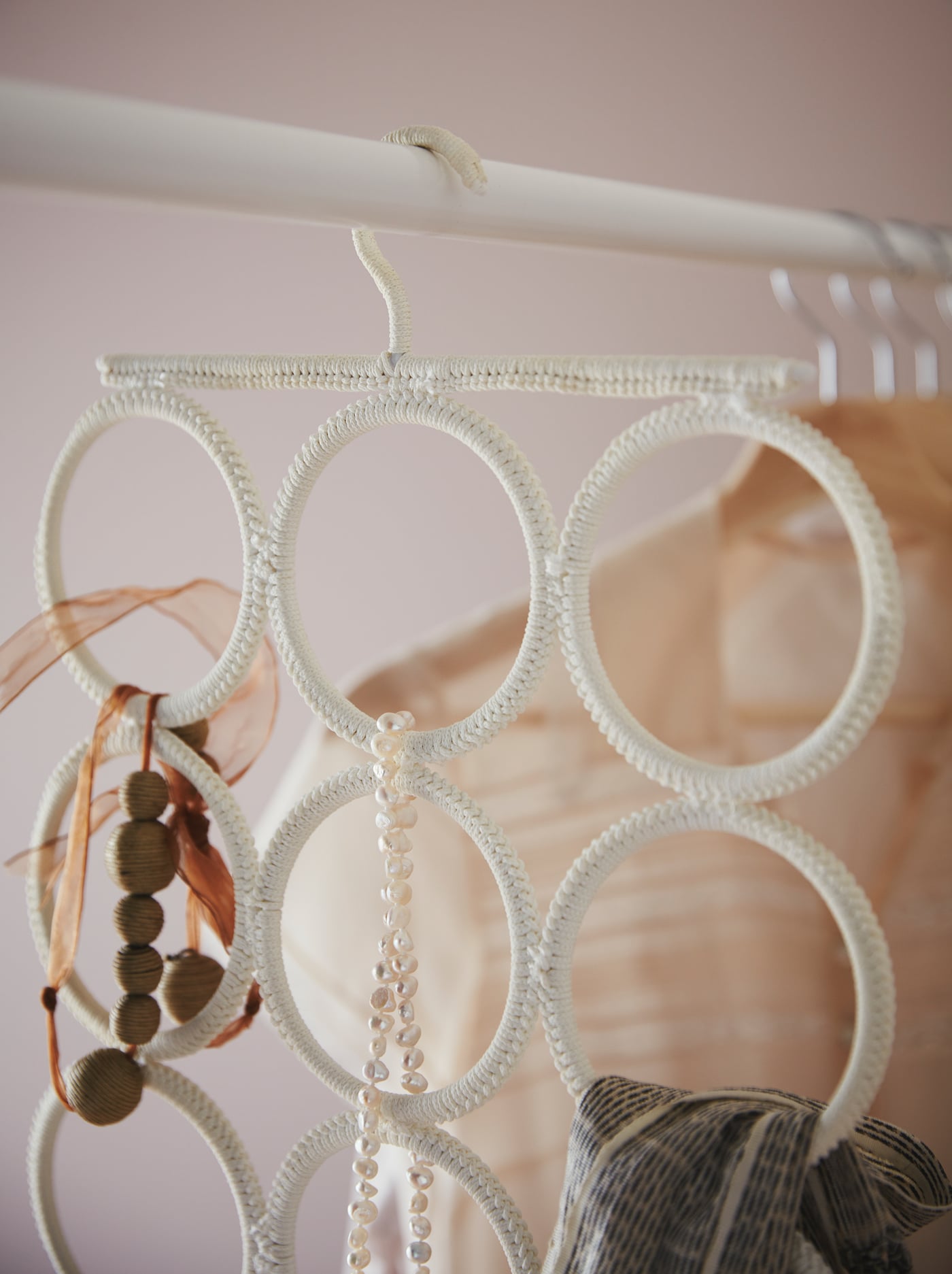 Scarves, necklaces, ties, bows, and more. The aptly named multi-use hanger is at your command. Also, anything you hang from it will look deliberate and artful.