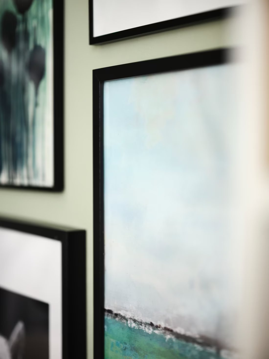 A truly practical, storage-centric home, their living area still feels inviting. Warm accents of green and soft textiles do the trick, but the gallery wall of art and photography adds an extra layer of intimacy.