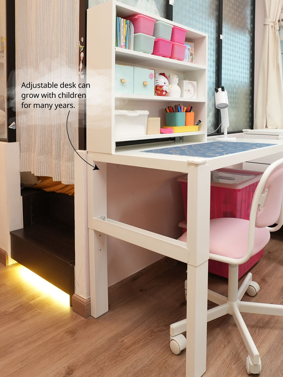 The corner previously used as clothes storage was transformed into the daughter's room and furnished in her favourite pink colour. The easy-to-move storage boxes underneath the desk can keep the frequently used items in place while encouraging her to tidy up. The storage boxes under the bed also keep seldomly used items and toys organised.