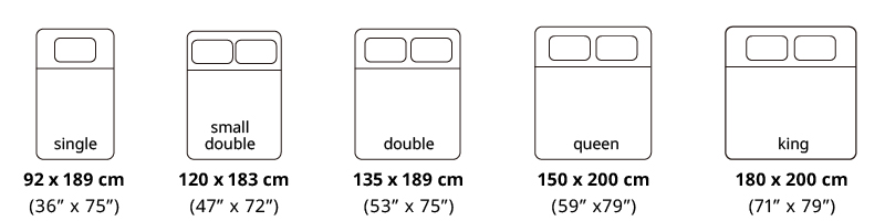 92x189 (3' x 6'3") 120x183 (3'11" x 6') 135x189 (4'5" x 6'3") 150x200 (4'11" x 6'7") 180x200 (5'11" x 6'7") |