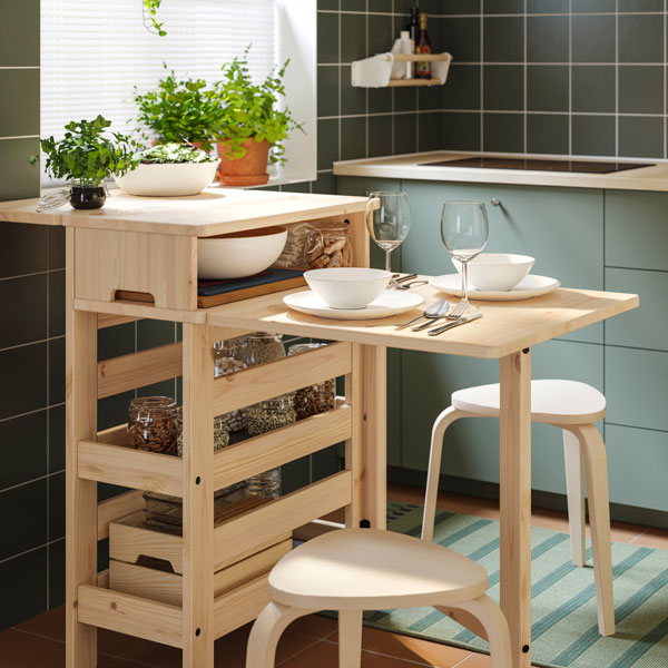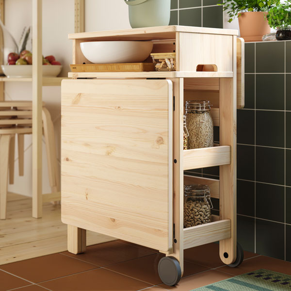 RESARÖ mobile drop-leaf table is a space-saving, multi-functional companion that comes in handy for dining, studying, preparing food or serving snacks while socialising. Storage keeps essentials nearby.
