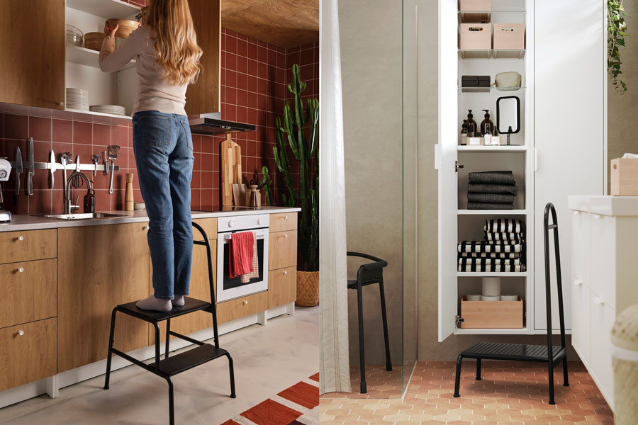 With a BÄSINGEN step stool with handrail as support, you can easily reach the top shelf of a kitchen or bathroom cabinet. Available in two models, with one step or two, it easily slides under a cabinet or can be stowed away in a corner when your chores are done, all in a smooth design that enhances your home.