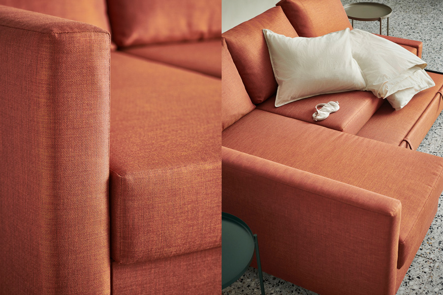 From a few metres away, FRIHETEN looks like a typical sofa. Come closer and you’ll realise that it’s anything but. Under the seats, there’s a large storage space and a mattress that pops up and turns FRIHETEN into a double-bed. Oh, before we forget, it’s now available in a new lovely brown-orange colour.