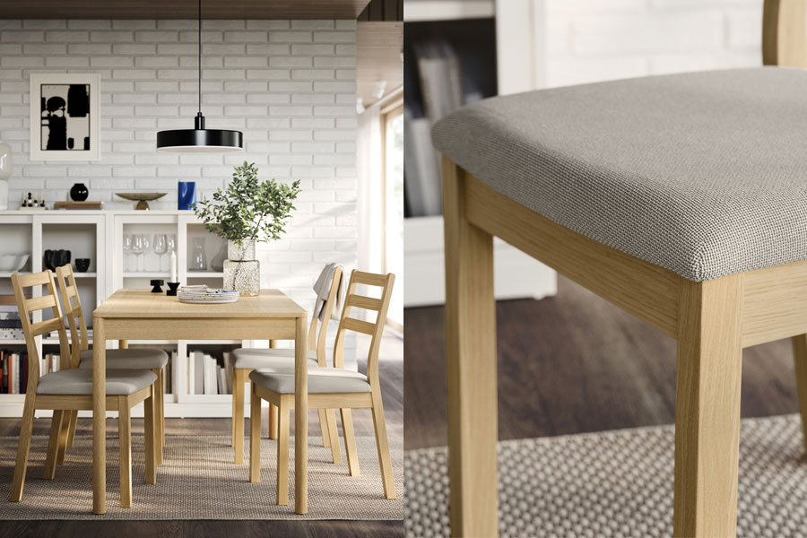 Crafted from high-quality materials and rounded soft design, the off-white or brushed oak veneer tables and fully upholstered chairs with washable covers make it perfect for both everyday dining and special occasions. Simple, practical, and timeless.