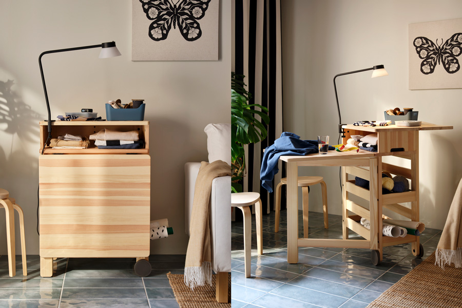 It's deceptively modest standing by a wall, but once this space-efficient transformer spreads its wings, it's another story. The RESARÖ drop- leaf table is a perfect match for on-and-off activities. Here, it serves as a multifunctional, inspiring and accessible art-and-crafts spot. Roll it out, unfold, unstack the KYRRE stools and get to it. Also, it's a great arrangement for being close when the children are over in their corner.