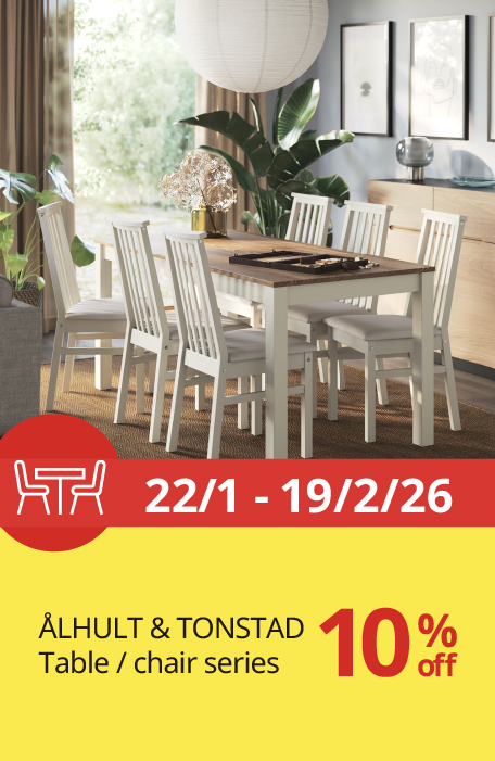 Every piece in this series brings its own unique charm, thanks to the grain of the ash veneer. With a sturdy design that works well in almost any modern interior, the versatile ÅLHULT offersa comprehensive range - including both fixed and extendable tables, soft seat chairs, and benches. You can easily mix and match chairs and tables to create the perfect set for your needs (and your budget will love you for it).