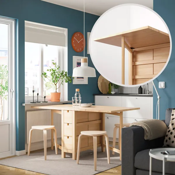 The NORDEN gateleg table seats 2–4 people, with adjustable drop leaves that makes it possible to adjust the table size according to need. When not in use, simply fold down the tabletop to save space. It is 32cm (12%") wide after folding, you can place against the wall or wall corner. With six storage drawers to keep everything organised, it helps maintain a clean and tidy home. Made from solid wood, it’s durable, beautiful, and crafted from a renewable material for a more sustainable choice.