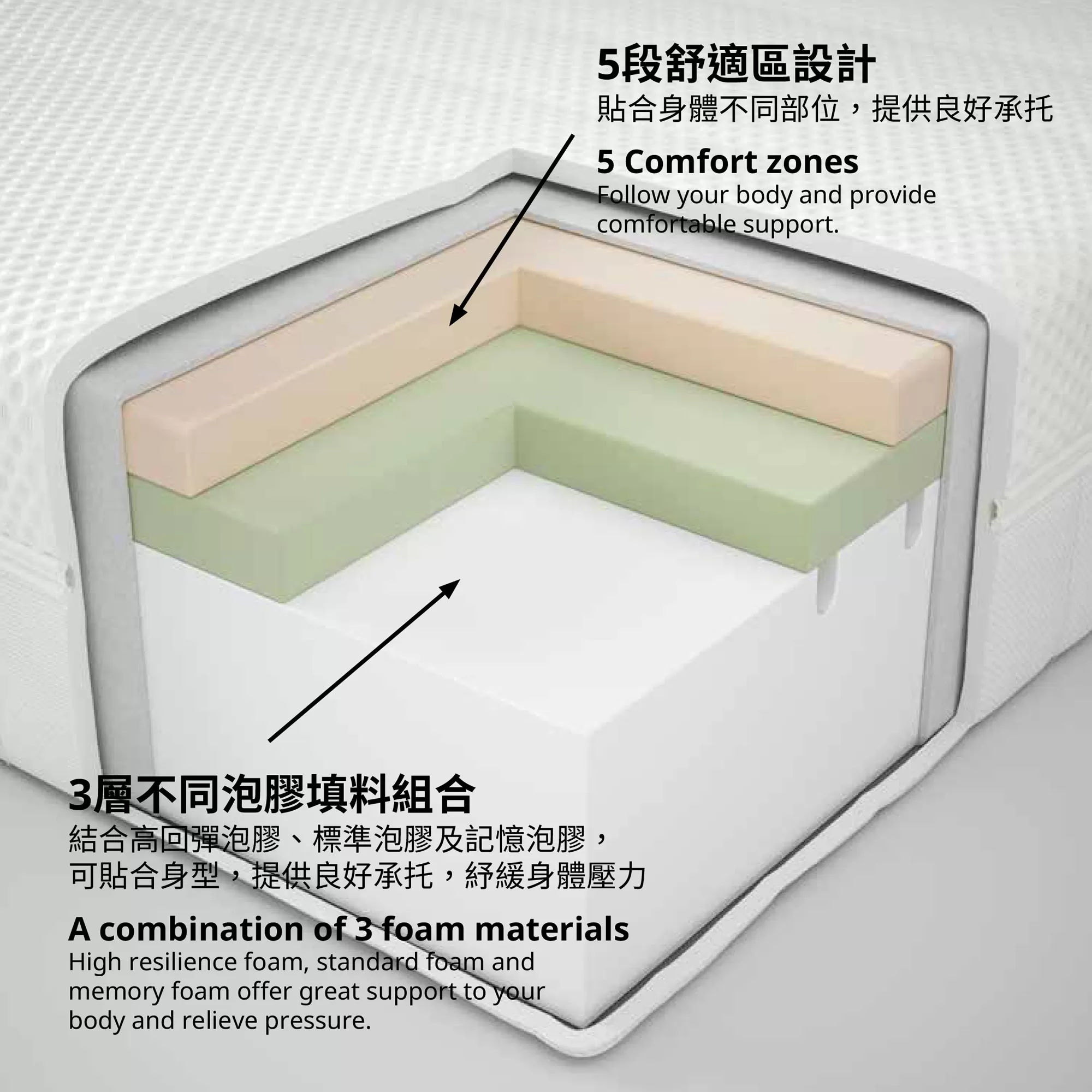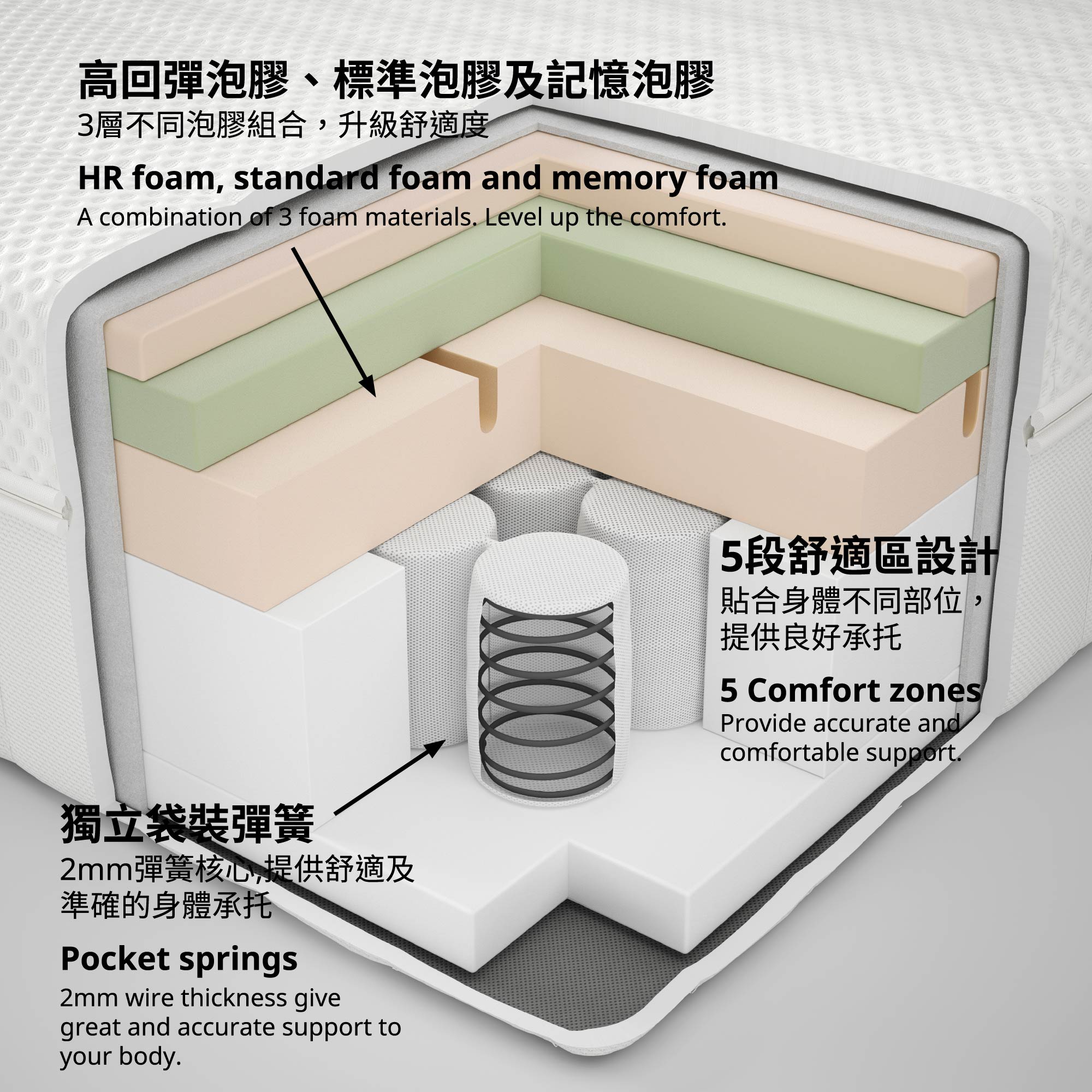 Multiple layers of foam, comfort zones and pocket springs that move independently to follow the body.