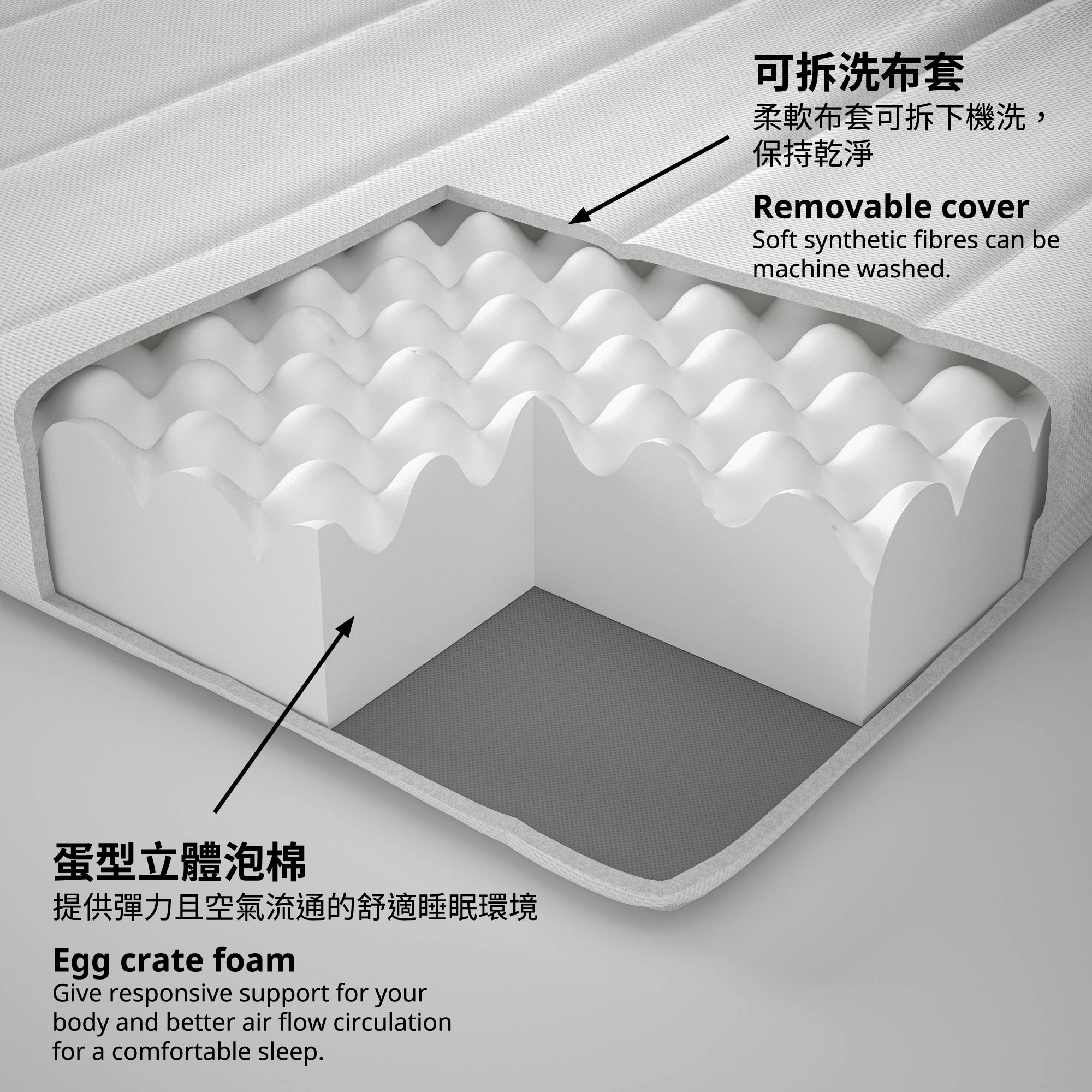 A firm 20 cm high foam mattress with 3 layers of comfort and support.