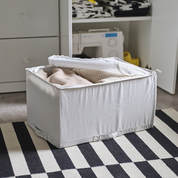 As well as organising things on shelves or inside drawers, STUK products can help you turn unused space into storage. It could be the top of your wardrobe or under your bed. This storage case has a lid with ventilation holes in it. It protects your clothes or duvets from dust and dirt on the floor but still keeps them fresh because the air can circulate.