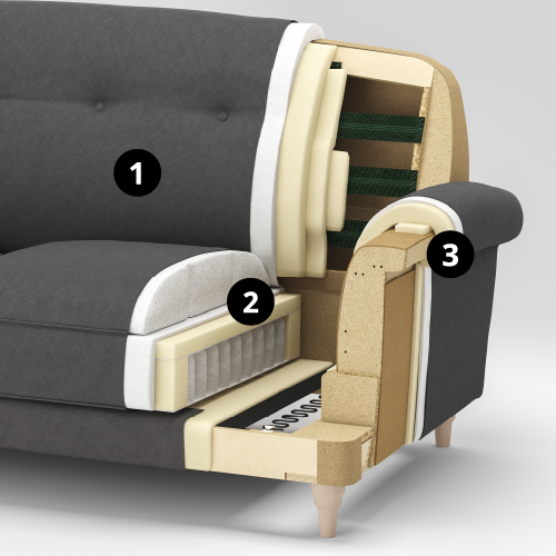 Pocket springs that follow your body combined with high-resilience foam and fibre balls means that you both sink into the sofa and get support where it’s needed to enjoy a relaxed sitting position.