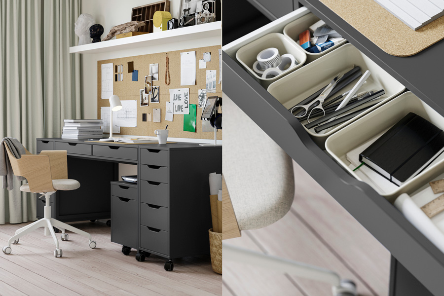 The ALEX setup creates an organised, colourful study corner with plenty of storage. Coordinated drawers, noticeboards, and shelves keep essentials, inspiration, and keepsakes in place. The split desk separates study from hobbies, while good lighting—a desk lamp for late work and a table lamp for relaxing—keeps the space both practical and cosy.