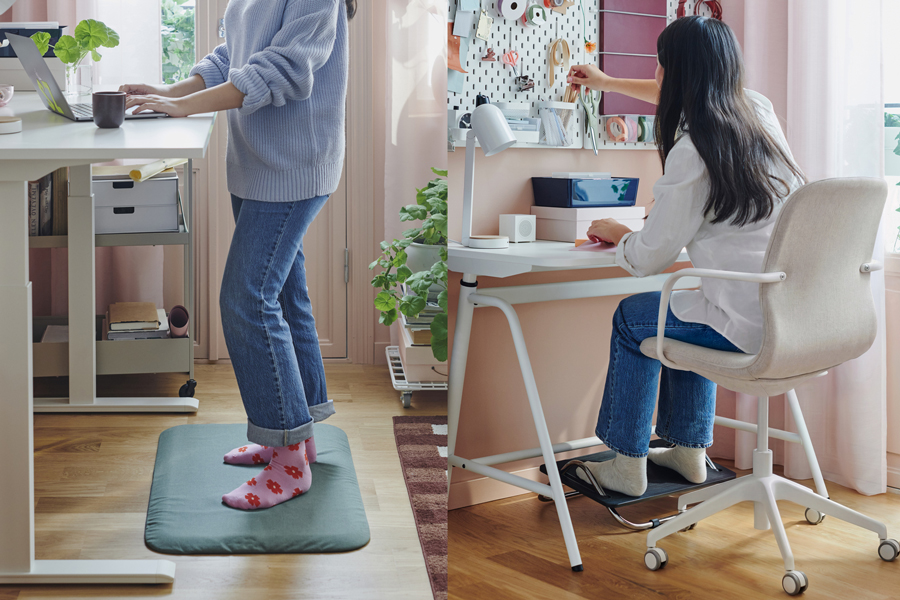 Standing up at your desk for parts of the day is good for your body, including your circulation. A thick FREIVID standing mat with a machine-washable cover makes it more comfortable. While putting your feet up on a DAGOTTO footrest can help you sit in a good position and reduce strain on your body. And you can use this ÖVNING multifunctional ergonomic footrest to support your lumbar region, knees and ankles, too.